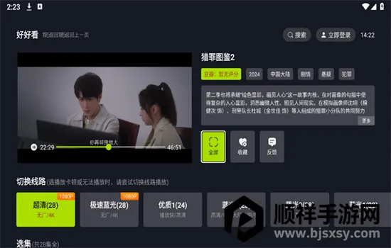好好看是一款影视播放与下载的应用软件,有海量高清影视内容,界面简洁,分类清晰,支持多画质选择。其智能推荐功能会根据观影历史和兴趣偏好推送个性化内容,还支持离线缓存。这里影视资源超丰富,涵盖电影、电视剧、综艺和动漫等。播放时稳定流畅,界面贴心,找片轻松有趣。而且无需登录就能永久免费观看,部分问题也有解决办法。无论是在家还是外出,它都能满足观影需求,是影迷的不错选择,值得一试。