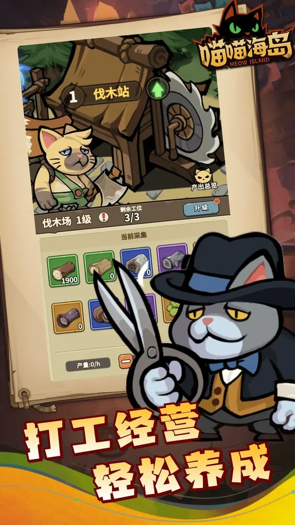 1. 轻松挂机,资源自动收获。可爱的喵喵们会在您的指挥下自动完成砍树、采矿、建筑施工等任务,离线归来也有惊喜,资源堆满仓库。