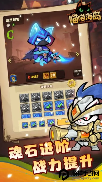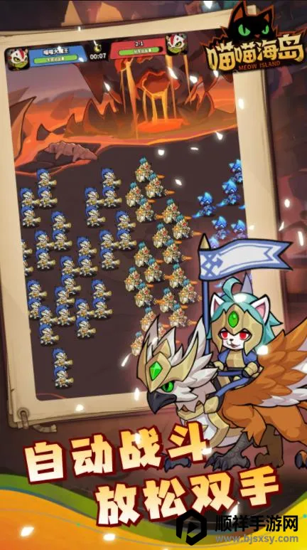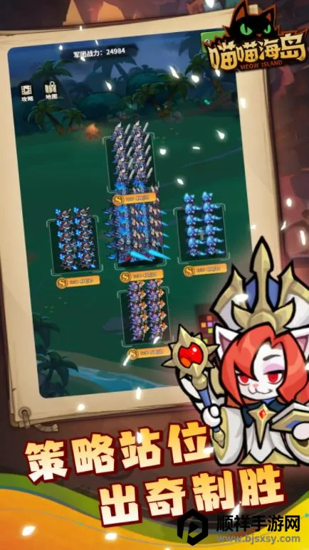 3. 召唤喵喵,策略搭配:收集资源制作金罐头召唤特色喵喵,它们各有所长。可根据战术需求自由组合,战斗喵和工匠喵助力海岛不断发展壮大。