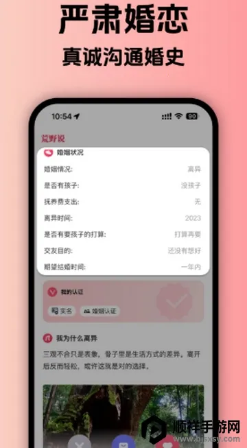 荒野说是专注高质量再婚的严肃脱单交友 APP,通过实名和婚史认证杜绝虚假。有多重认证构建高品质平台,能发布动态,专业红娘牵线。提供实名认证保障、智能匹配等功能,优势众多,助离异人士安心脱单。