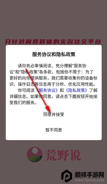 1、打开荒野说app,点击同意隐私政策