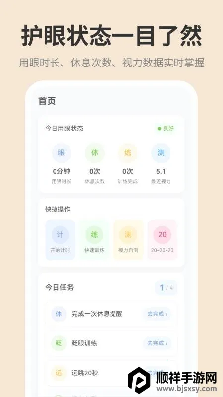 3. 全面功能呵护:不仅有眼球专业放松训练,每天提醒完成护眼任务,还隔段时间进行眼部测试,涵盖多种场景模式,适配不同环境和习惯,全方位守护视力。