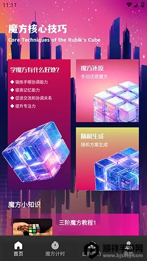 4. 智能便捷的操作:告别死记硬背公式,智能推荐最优复原方案,用清晰图文演示还原步骤,还能添加图案让系统计算步骤,进入软件可查看海量核心技巧,有魔方计时和虚拟魔方等便捷功能。