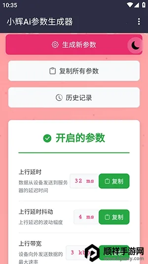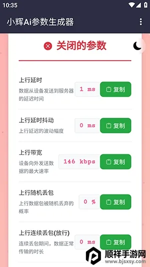 小辉Ai参数是一款专为网络性能测试和游戏体验调优打造的工具。它支持多场景弱网模拟,可自由自定义网络延迟、丢包率、带宽等核心参数,无需Root权限,全程无广告无会员限制,下载后即可使用。其特色包括智能网络诊断、参数优化引擎、场景智能适配和连接加速技术等。使用时,进入软件可查看完整参数设置,选择所需弱网参数一键复制,也可一键生成新参数,还支持查看历史参数生成记录。如果你有网络测试和优化需求,这款工具值得一试。