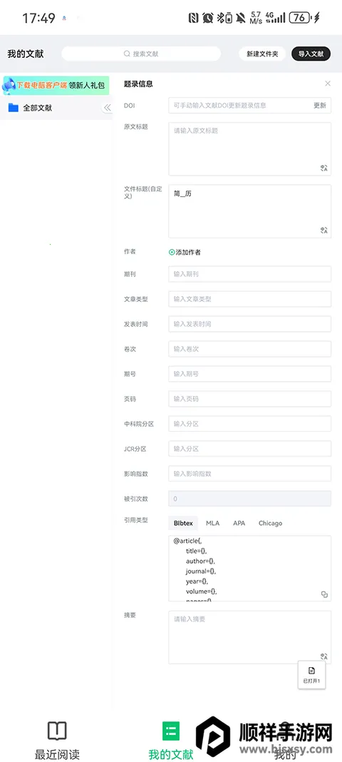 4、文献管理超智能:展示文献题录信息,无限级新建文件夹,管理标签筛选搭配智能搜索,精准锁定文献,方便又高效。