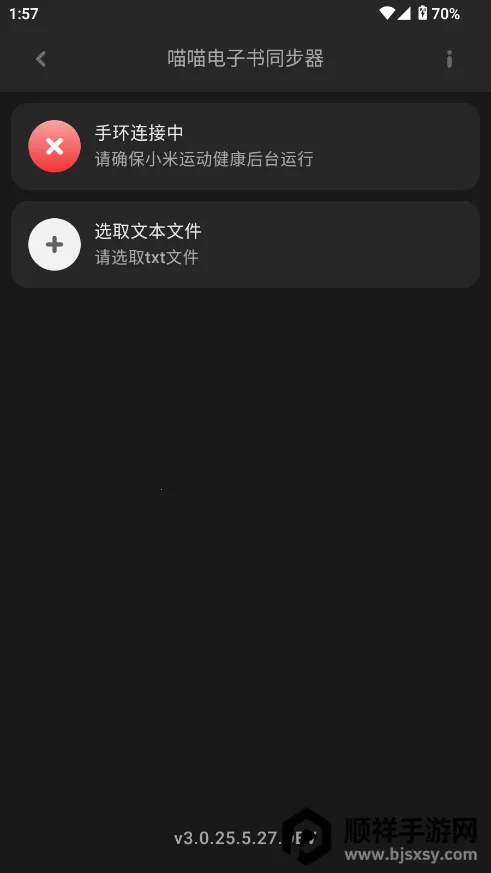 喵喵电子书同步器是一款超棒的软件,专为小米手环用户打造。它能让你随时随地享受阅读乐趣。有很多便捷功能,比如能根据个人需求调节字体大小、背景颜色和翻页速度,打造舒适阅读环境。软件绿色安全无广告。操作也简单,进入首页先确认小米手环连接,点击下方选取文本文件导入书籍,再点击推送就能抬腕使用。它支持批量书籍管理,查找切换更高效;有智能省电模式,兼顾续航与便捷;内置阅读统计功能,助你养成阅读习惯。亮点更是多多,能智能分割同步TXT格式电子书,自动适配手环屏幕;跨设备自动记录阅读进度,无缝衔接续读;针对手环操作逻辑优化体验,抬腕顺畅阅读;还支持多种类型阅读内容。有了它,轻松解决在小米手环上阅读电子书的需求,带来极大便利。