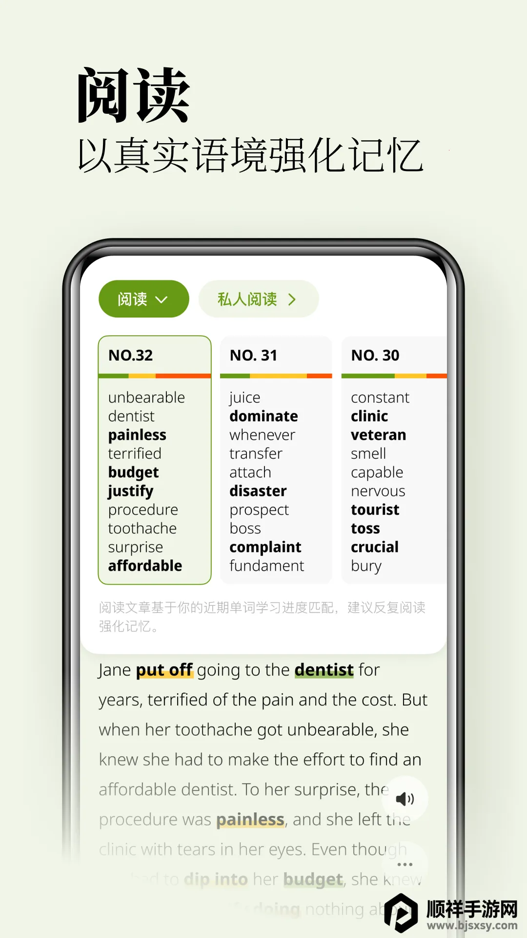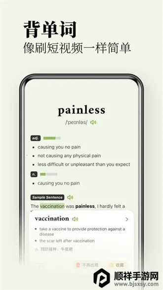 无痛单词是一款超棒的背单词软件,特别适合考研学生和职场人士。它有全阶段词库,从小学到留学各阶段都覆盖,像四级、雅思、GRE等考试专项词书也有。学习超轻松,上滑切换单词卡片就行,操作跟刷短视频似的。系统会按停留时长判断单词掌握程度,不用手动标记。还有弹性学习计划,能打破单词债焦虑。软件核心算法会深度分析行为数据,生成个性化记忆曲线,精准复习。它功能超多,语音训练能练口语,复习技巧实用,还有统计数据帮调整计划。软件特点也丰富,能定制专属单词表,跟读练习提升口语,多种背诵功能可选。会员权益也不错,有无限单词学习量、AI私人阅读等。总之,无痛单词能帮你高效背单词,轻松解决记单词难题,强烈推荐!