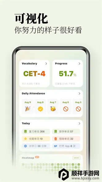 2、学习轻松便捷,上滑切换单词卡片,系统自动判断掌握程度,省去手动标记繁琐步骤。