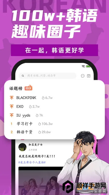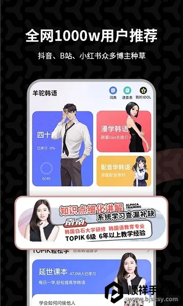 羊驼韩语这款软件能帮你解决韩语学习的问题。它里面有超多不同类型的韩语课程,你可以根据自己的学习进度自由选择。软件使用起来很方便,进入首页点击40音学习,先学元音辅音,还能参加综合复习测验发音水准。这里所有韩语词汇都有中文及罗马拼音,方便记单词。还有日常场景的韩语对话模板,能让你学到实用句子。特色的韩语爱上配音板块,有各种著名韩国综艺场面供你学习配音,提升口语水平。遇到不懂的韩语单词还能收藏方便查看。它界面简洁、内容丰富、功能齐全,从基础读音到听说读写全面提升你的韩语能力。而且支持备份云端保存学习数据。至于是不是免费的,软件有免费和付费课程,付费课程性价比不错,能满足不同需求,想学好韩语的快来试试羊驼韩语吧。