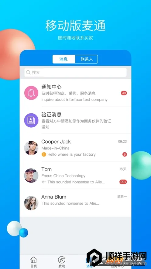 国际化沟通渠道:该软件连接了国外的采购平台,为用户带来国际化的实时沟通交流渠道,让供应商会员能及时跟海外采购商在线洽谈,实时翻译,推荐产品,促进商务洽谈畅通无阻。