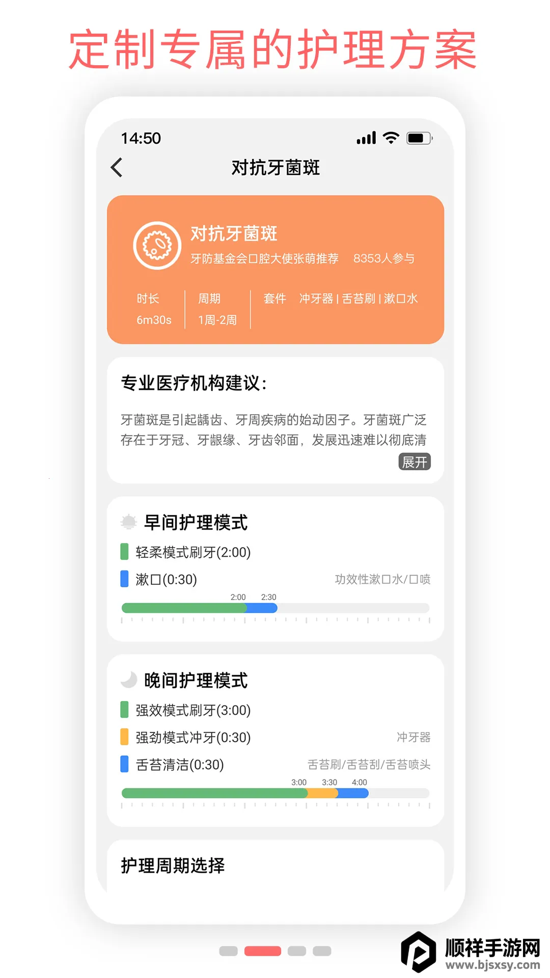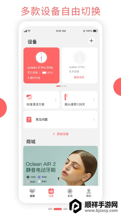 2、智能设备连接:可搭配各种智能设备,如智能声波电动牙刷、冲牙器等,通过软件设置连接功能、刷牙方案等,还能查看设备电量、订单状态等。