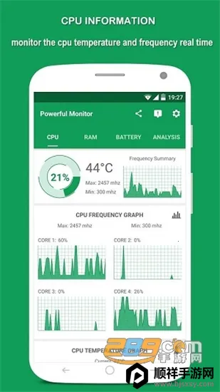 强力监测App是一款超实用的手机优化工具。它能全面扫描手机后台运行应用,让你直观了解手机后台状态,还提供智能后台优化服务,使手机使用更流畅。其硬件检测功能可帮你轻松知晓手机各项参数及存储空间占用情况,方便管理手机。最新版更是功能强大,支持多主题切换,能自动控制系统耗电功能来节省电量、延长电池使用时间。它可实时监测CPU温度、频率等,还能分析历史数据,支持多核CPU频率同时监测。当CPU或电池温度过高时会触发高温警报。此外,还有简洁强大的垃圾清理、内存加速功能,以及电池监测、一键加速、悬浮窗展示等特色功能。能帮你解决手机性能、电池保养、存储空间管理等问题,让你的手机时刻保持最佳运行状态,快来下载体验吧!