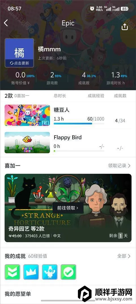 3、绑定后返回“我的”页面,点击Epic选项进入账号详情,选择“全部游玩游戏”即可查看库存。