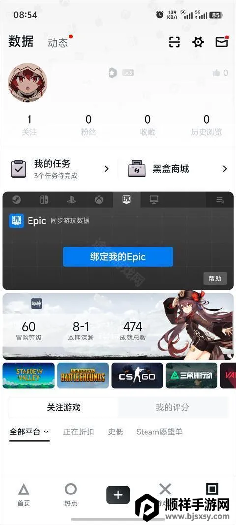 1、在手机应用商店搜索并安装“小黑盒”,打开app后点击底部“我”,选择Epic图标进入绑定页面。