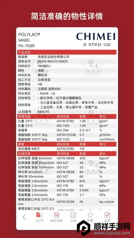 物性表安卓版是深圳塑造新材料技术有限公司打造的材料检索与采购软件。能快速找原料,掌握性能参数。有强大搜索、多方式匹配等功能,还能缓存查阅、社交分享,助力材料选型与采购决策,更新日志记录版本优化。