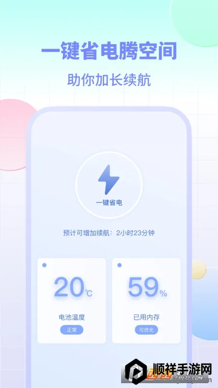 一键省电超便捷,能有效腾空间并加长续航时间,让您无需担忧电量不足问题。