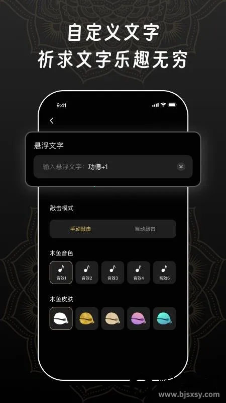 3. 个性化十足:支持用户对电子木鱼工具进行个性化设置。不仅能自定义敲击木鱼时的悬浮文字,如祈福功德平安好运等,还能自由设置自动敲击木鱼的定时时间,释放双手,更有内置多种木鱼音色和丰富皮肤资源可供挑选,满足不同用户的个性需求。