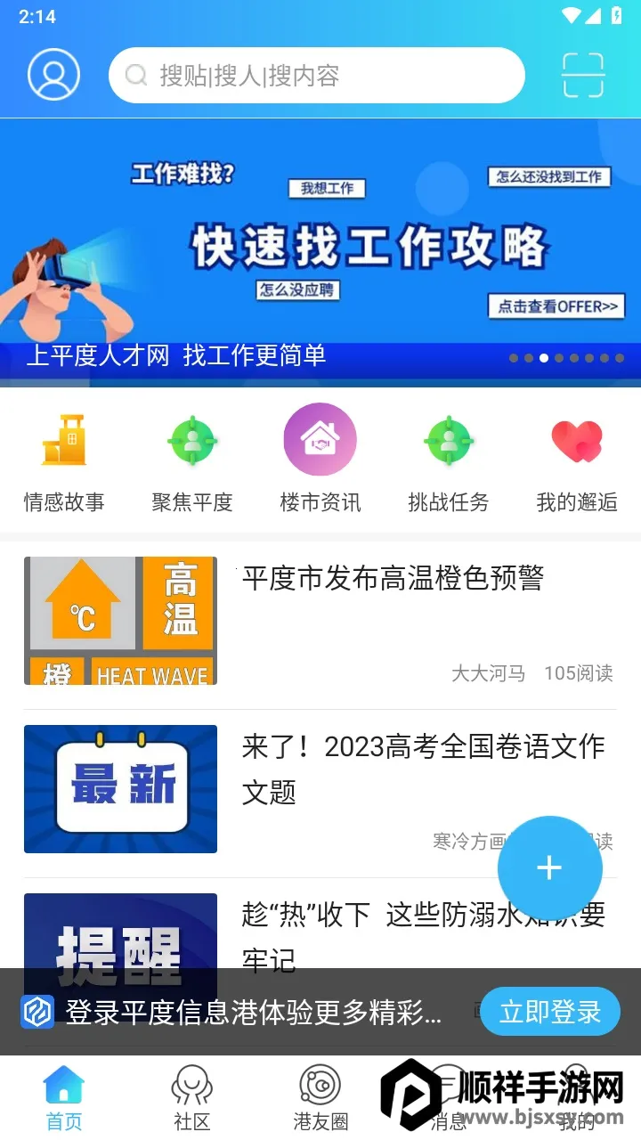 平度信息港能满足你查找最新招聘信息的需求。它是一款超实用的政务便民软件,由青岛明行足信息技术有限公司研发。这里有各行各业齐全准确的企业数据库,能为你提供海量最新招聘信息。你可以轻松在上面找到适合自己的工作。而且它使用方便,登录应用首页,顶部搜索框能快速查询招聘帖子和用户信息,底部多功能入口也很便捷。不管是全职、兼职,还是不同行业领域的招聘,都能在这里找到。同时,它还涵盖房屋出租、二手交易、同城交友、新闻资讯等各种生活服务功能。在这里,你不仅能找工作,还能享受各种便利生活服务,和同城好友交流热点新闻与趣事。有了平度信息港,找工作和享受生活都更轻松啦!