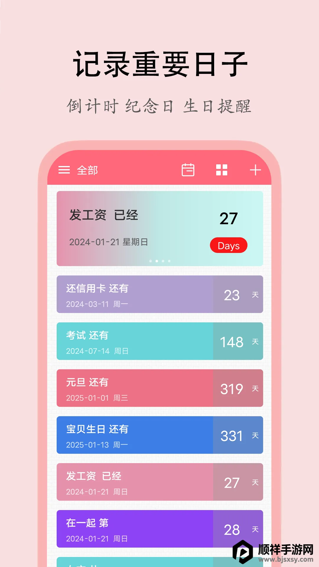 这款生活小工具超棒!它能帮你记录各种重要日子,像生日、纪念日等。添加后即刻开始倒数,还能设置闹钟提醒。每个事件可用不同颜色标记,按时间顺序查看,支持正数。它支持农历和公历,独创记录提醒功能让生日和节日依序倒计时并提醒。能对时间合理规划,充分利用休闲时光。还有多种可爱图标和背景免费使用,支持导入自定义背景图片。操作简单,功能全面,能帮你告别拖延症,养成好习惯,是个超好用的工具!