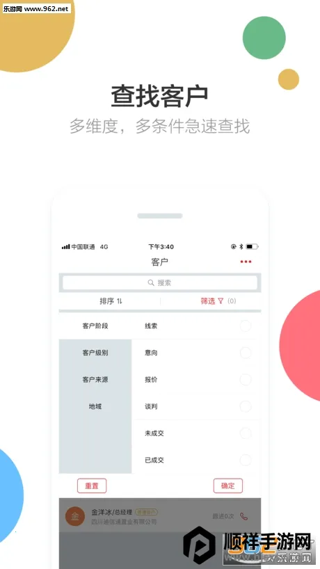 客户资源管理便捷:风程销售能轻松帮助销售人员解决客户资源管理难题,快速检索目标客户,一键筛选重要客户和意向客户,随时随地查看客户跟进阶段,将客户公关信息准确归档,有效降低客户流失率,积累老客户。