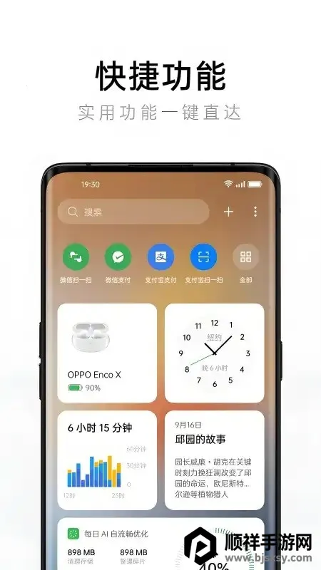 OPPO速览是一款超实用的手机内置应用程序。它功能强大,涵盖工作和生活诸多方面。开启后,能快速获取信息,方便调用常用功能,还有无需下载安装的快速应用程序。比如绑定手机号可查询快递物流动态,实时显示天气和股市行情,快速查看个人笔记及应用使用时间等。
