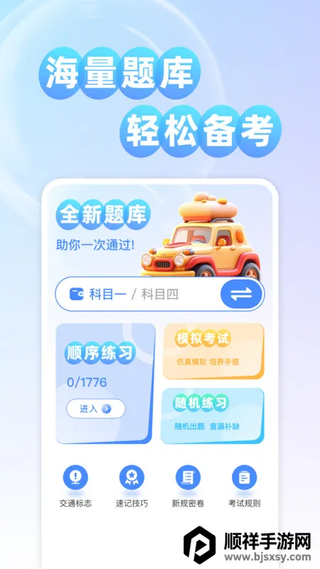 考驾证题典最新手机版是一款自由驾考学习 app,涵盖超多真题。能依当地城市推送适配试题,有详细解析。可顺序练习、速记技巧刷题,能查准确率,以图文呈现内容,助你熟悉题型,轻松备考。