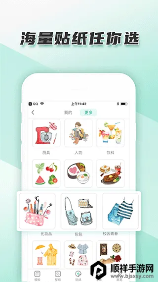 1. 海量素材库,提供数千种免费素材,涵盖复古、卡通、水彩等多种风格,包括壁纸、贴纸、胶带、字体等,满足多样创作需求。