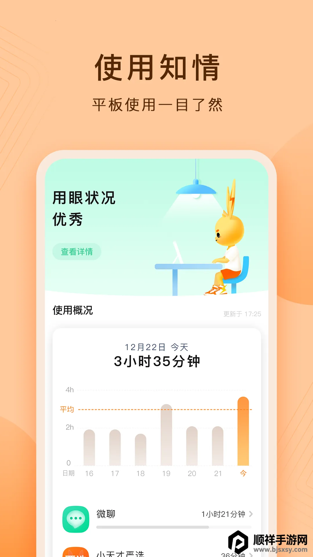 如果你关心护眼平板是否真能护眼,那这款护眼平板APP值得了解。它能帮家长全方位管理孩子平板使用。通过它,家长可清晰掌握孩子用眼习惯、姿势及环境光线,实时守护儿童用眼健康。还能了解孩子平板整体及各应用使用时长、新安装APP情况。有了家庭微聊功能,沟通超方便,文字、语音、图片、视频随意发。能禁用违规应用,设置应用商店年龄限制,管控上网风险,确保孩子健康上网。像应用闪退、无法更新等常见问题也有解决办法。有了它,家长能更好引导孩子合理使用平板,一定程度上为孩子营造健康的平板使用环境,助力孩子在健康用眼的前提下享受平板带来的便利。