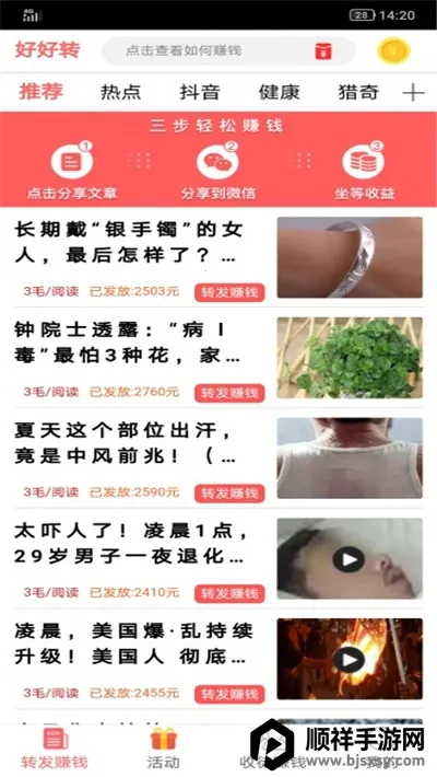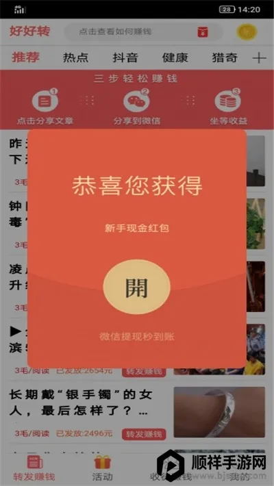好多人都在问“好好赚是真的吗”?今天就来给大家好好讲讲。好好赚APP是一款娱乐赚钱软件,能满足你边玩边赚的需求。它提供各种类型的文章,像新闻、养生、搞笑等,让你轻松找到感兴趣的内容。阅读文章就能得金币,读得越多奖励越多,分享文章还能领红包。