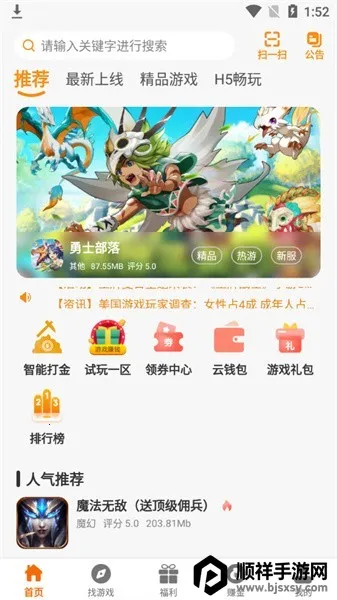 神游互娱手游研发中心,能满足你对各类手游的需求。它是一款超棒的手游盒子软件,有海量游戏资源,射击、休闲等各种类型应有尽有。这里所有游戏免费,操作简单,还能免费领福利包,体验多样玩法。有全面的游戏排行榜,不知玩啥时能参考找优质游戏。海量游戏攻略方便查看,传递最新游戏信息。全球首家实现大型游戏一键下载安装,自动适配机型,省去找数据包烦恼。每天及时发布最新游戏,分类专题全。高速下载通道,支持后台下载与断点续传,下载体验极速稳定。还能免root安装应用与游戏,守护真机安全,24h在线不N机,不怕断网关机,不占手机资源。能让你轻松找到爱玩的游戏,尽情享受游戏乐趣,快来下载体验吧!