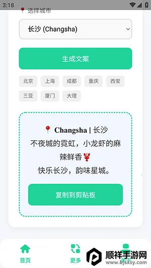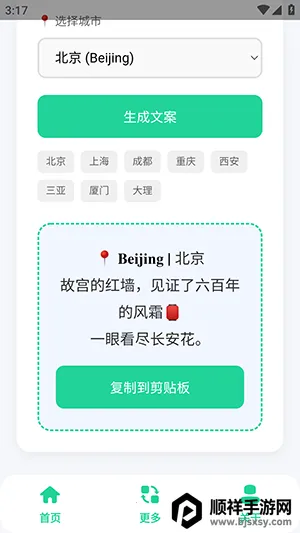 一款超棒的软件,能帮你轻松搞定旅行文案。它提供丰富多样的旅游文案,涵盖各地。选择目的地后,文案生成超便捷,还能包含Emoji。复制方便,无需广告付费。界面简洁,快速找到所需功能。复杂文案也能生成,因搭载AI大模型。资源汇集,素材齐全小众不撞款。搜索、保存合集都轻松,让你的旅行分享更出彩,朋友圈因它更有特色,让每次旅行记录都别具一格,为旅途增添独特魅力。