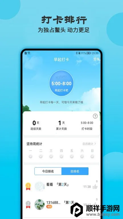 天天早起打卡最新手机版是一款助力用户养成健康作息、提升自律能力的习惯养成软件。具备早起打卡、打卡日历统计、每日美句、目标挑战等功能,还有社区互动,助你告别拖延,建立积极生活方式。