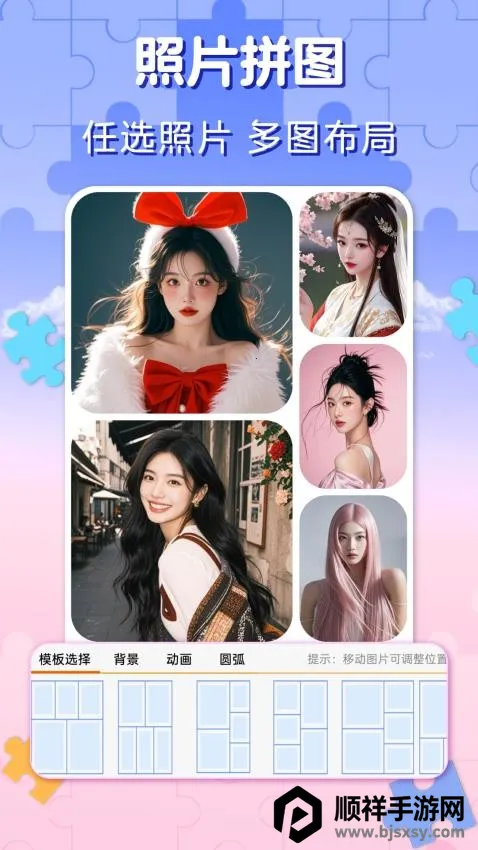 1. 海量模板随心用:拥有海量创意模板,涵盖多种形式,支持常见比例及特殊形状,满足不同场景需求。用户还能自由拖拽照片,突破模板限制,实现个性化自由拼接。