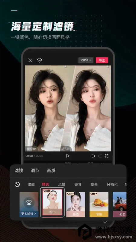 3. 效果出色:专业风格滤镜一键美颜,智能识别脸型定制专属方案,多种画面调节选项拯救视频色彩,让生活秒变大片。