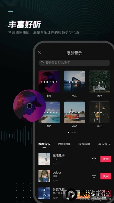 2. 素材丰富:有海量曲库,包括抖音独家歌曲,还有独家设计手绘贴纸、多种风格字体等,为视频增添乐趣。