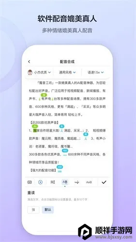 1、丰富音色选择:提供魔鹤仙老头音、魔樱桃萝莉音等角色声音,还有魔弘毅、魔岩刚等新闻广告专用音色,以及老顽童、魔玲珑等有声小说配音,覆盖广泛行业需求,满足不同场景需求,塑造生动角色形象。