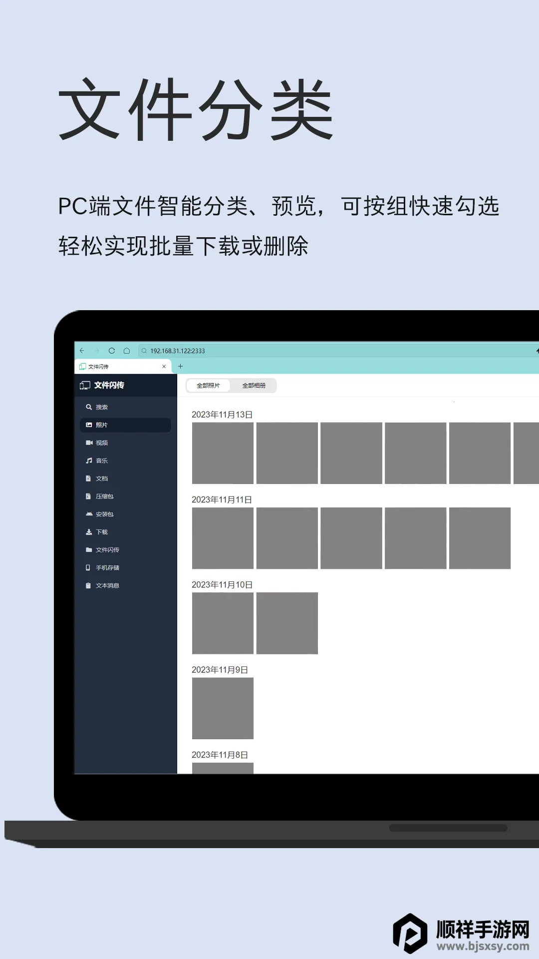 文件闪传2025官方最新版本是一款高效便捷的文件传输工具,支持Android手机与电脑无线互传多种文件,如图片、视频等。具备无线传输、分类浏览等功能,操作简便,传输高速稳定,还能加密保护隐私,满足多场景需求。