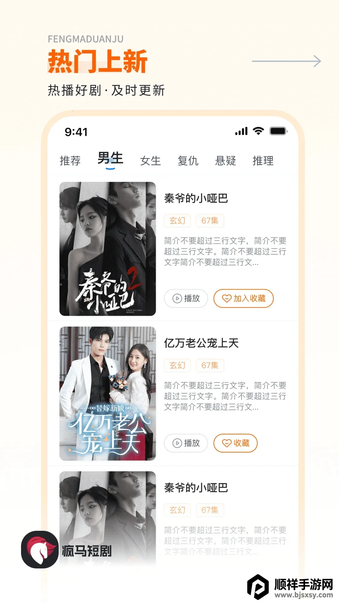 疯马短剧是专注提供高质量短剧的手机应用。有喜剧、悬疑、爱情等多样类型,内容更新快、画质清,支持离线下载。界面简洁易上手,无需注册可直接浏览,部分高级短剧需付费,整体能带来轻松愉快的娱乐体验。
