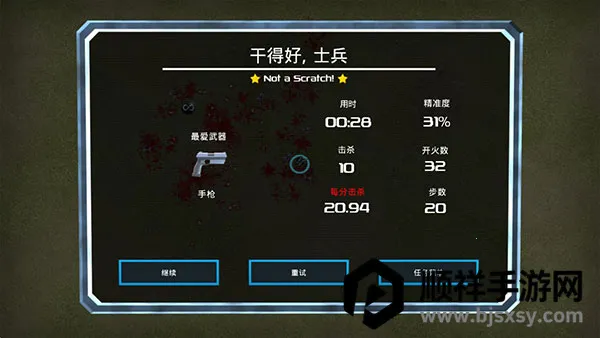 出色画面与音效:游戏画面为2D俯瞰视角射击,效果绚丽,战斗场面血流成河,战场范围广阔,敌人一波波袭击很有气势。声音方面,整体音乐紧张刺激,配合游戏节奏,射击枪声逼真,给玩家带来沉浸式体验。