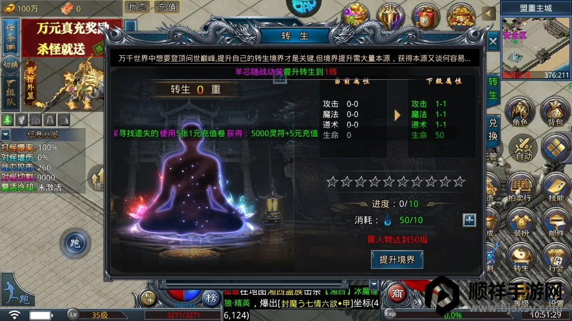 4、到达一定等级后可对游戏角色进行转生,转生可以大幅其实游戏角色的属性上限。