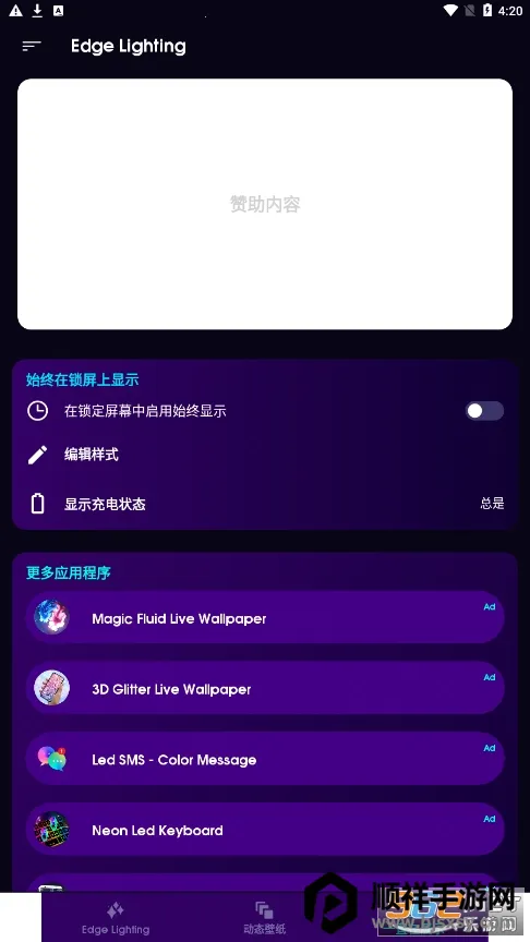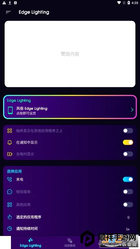 Edge Lighting是一款独具魅力的软件。它能为手机边缘增添炫酷RGB灯效,仿佛给手机装上了流动特效灯。提供丰富预设颜色与形状,可自定义文本边框、灯效及动画速度,适配各类屏幕。亮点众多,多种预设让曲面屏璀璨,提醒闪烁样式自由设,还能自定义文字边框。使用方便,下载打开点击卡片就能调整参数。一键激活边缘照明,模式随心切换。若没效果,可检查系统、重新启用或安装、确认设置等。总之,它能满足个性需求,带来独特体验。
