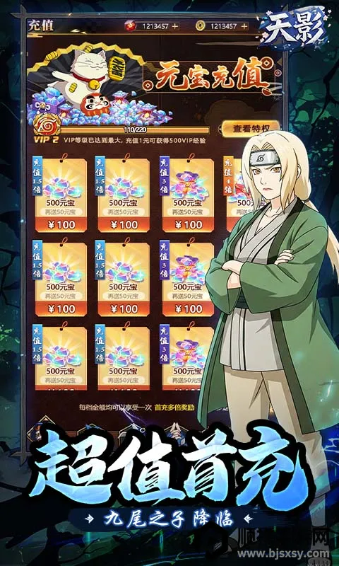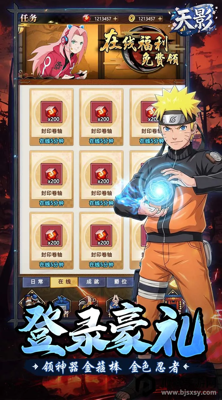 3. 丰富福利:全场充值0.1折,登录领神器、金将忍者,等级福利狂送400抽,主线闯关结缘专属金忍,忍者收集集结专属小队,超值首充九尾之子降临。