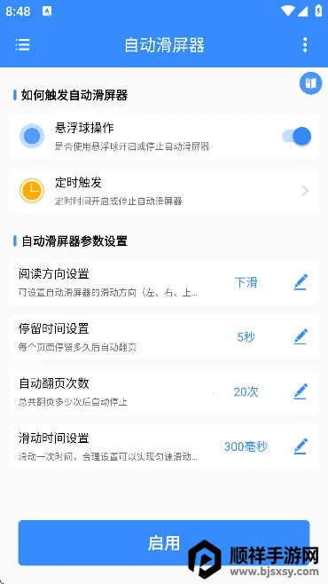 使用方法简单:先下载安装并打开,第一次用要自定义开启相关权限。接着设置好参数,如滑动方式(左滑、右滑等)、停留时间、自动翻页次数等,还能修改悬浮球大小和透明度,然后点击启用就可以啦。