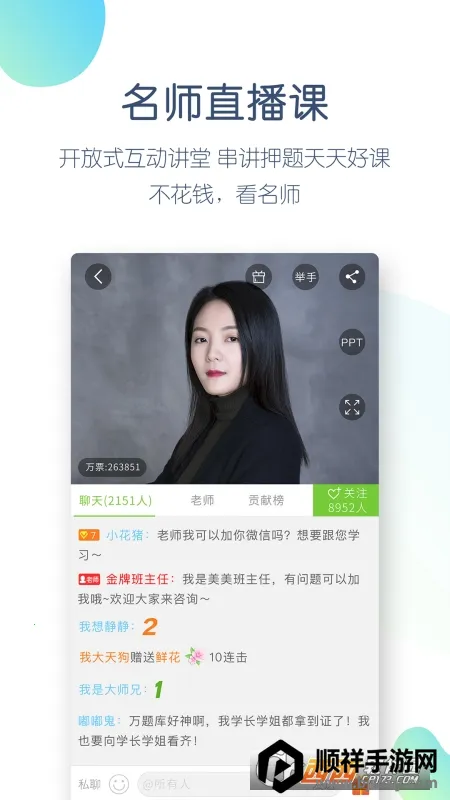 免费直播课程:全天免费直播课程都可随时观看学习,实时观看名师直播课程,随心互动答题,更好的学习知识点。