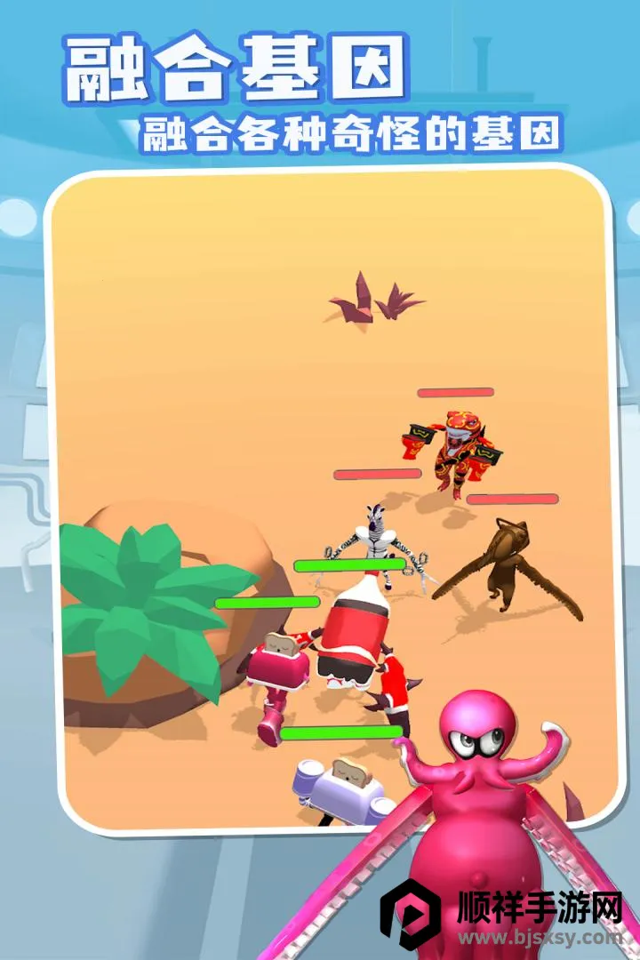 融合大作战是休闲格斗游戏,玩家能将各种物品融合成异形格斗士。可自由创造组合,物品能解锁。融合后角色出战对战,还有新手攻略。画面卡通可爱,玩法简单,有多种亮点特色,如即时对战等。