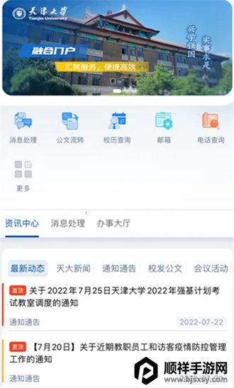 融合门户为天津大学师生打造便捷服务平台。它与学校信息网络结合,涵盖多方面信息化管理。能发布公共信息,实现信息交互。在这里,师生可轻松获取校园最新通知公告,关注校园动态。还能在线办事,足不出户办理各种事务。享受贴心校园生活服务,满足多样需求。无论是办公、教学还是生活,都能便捷获取所需信息,让校园生活更轻松、高效,是一款非常实用的平台。