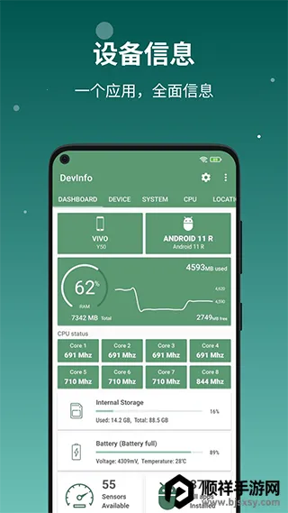 设备信息app可一键查询手机平板等移动设备所有硬件参数信息,如处理器、屏幕型号等,功能免费。还能查看内核版本、检测传感器状态,有存储分析、应用分析、设备测试等功能,提供实时手机温度内存清理等实用工具。