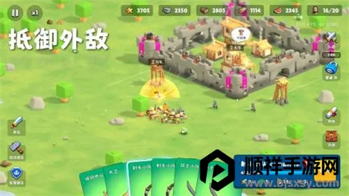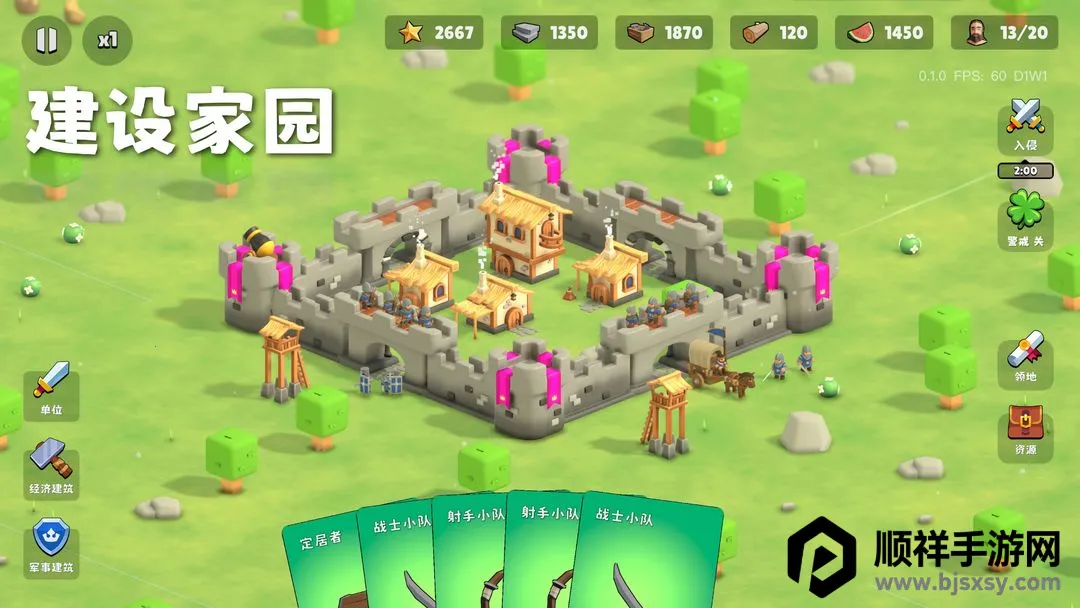 2. 巧妙融合塔防机制,修筑城墙、招募兵种,抵御敌人进攻,守卫家园。