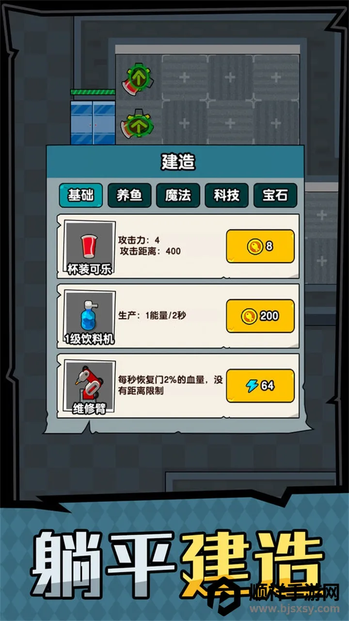 1. 采用休闲塔防玩法,玩家需紧闭房门,建造防御设施抵挡老板催促,摸鱼赚取金币用于建造或升级建筑。