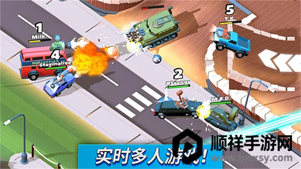 2. 多样的车辆与道具:有270多辆4种不同级别可解锁汽车,330多种皮肤自定义,还有416种可升级强化道具,包括喷火器、大炮等,助你在对战中更具优势。